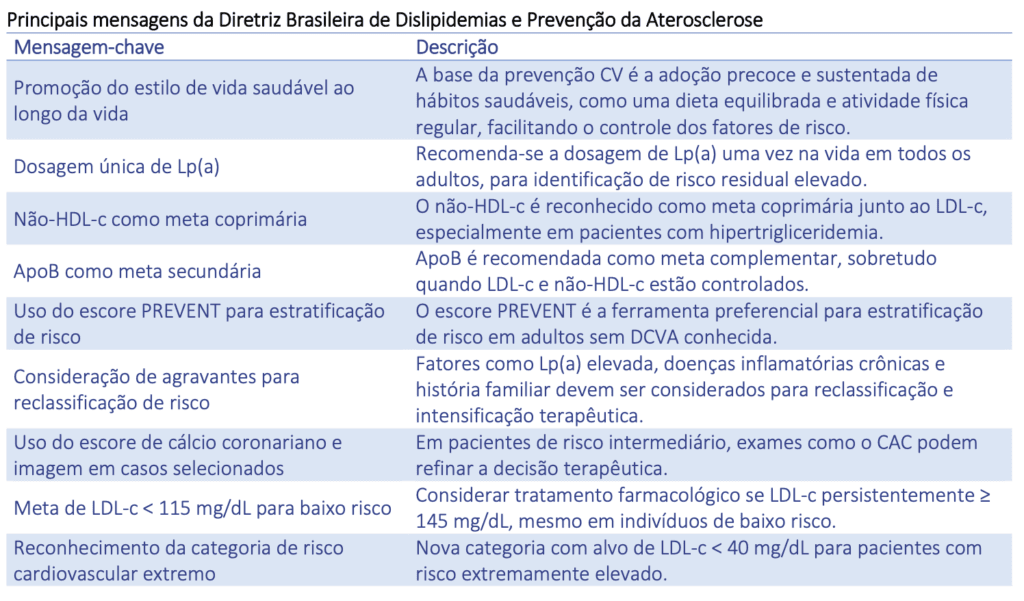 Diretriz de Dislipidemias e Prevenção da Aterosclerose de 2025 atualiza e expande os conceitos da versão de 2017, e, avançando para a estratificação progressiva até os níveis de risco muito alto e risco extremo, inclui os fatores clássicos, mas também biomarcadores, como Lipoproteina (a) [Lp(a)], Apolipoproteína B (ApoB) e Proteína C Reativa – ultrassensível (PCR-us), além de ferramentas de imagem para detecção de aterosclerose subclínica, como o escore de cálcio coronariano (CAC). Com base nessa estratificação ampliada, as metas terapêuticas tornam-se mais intensivas para aqueles em risco extremo.
