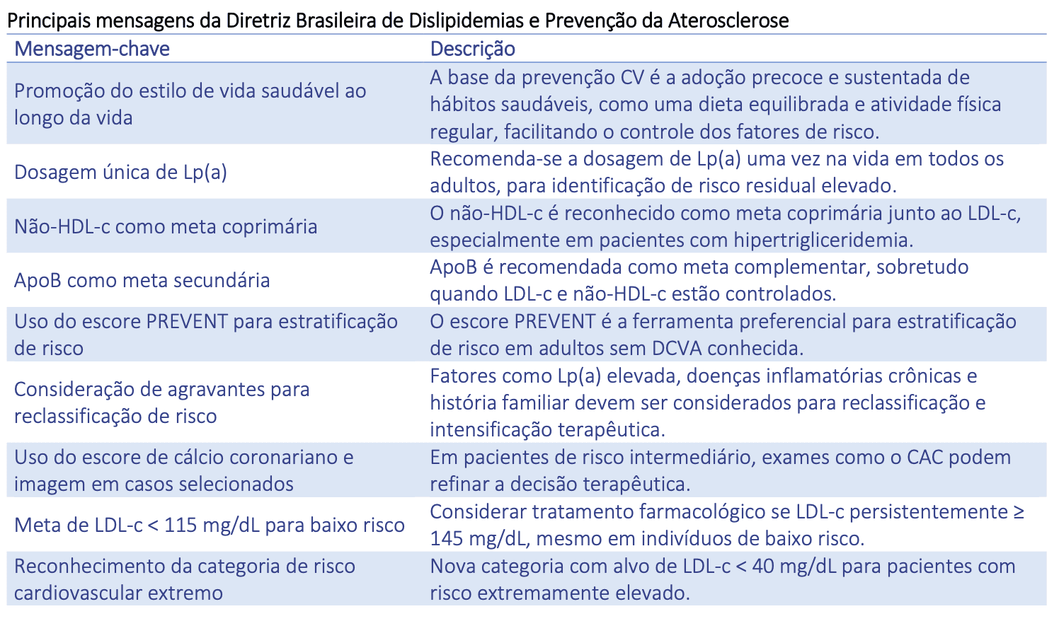 Diretriz de Dislipidemias e Prevenção da Aterosclerose de 2025 atualiza e expande os conceitos da versão de 2017, e, avançando para a estratificação progressiva até os níveis de risco muito alto e risco extremo, inclui os fatores clássicos, mas também biomarcadores, como Lipoproteina (a) [Lp(a)], Apolipoproteína B (ApoB) e Proteína C Reativa – ultrassensível (PCR-us), além de ferramentas de imagem para detecção de aterosclerose subclínica, como o escore de cálcio coronariano (CAC). Com base nessa estratificação ampliada, as metas terapêuticas tornam-se mais intensivas para aqueles em risco extremo.
