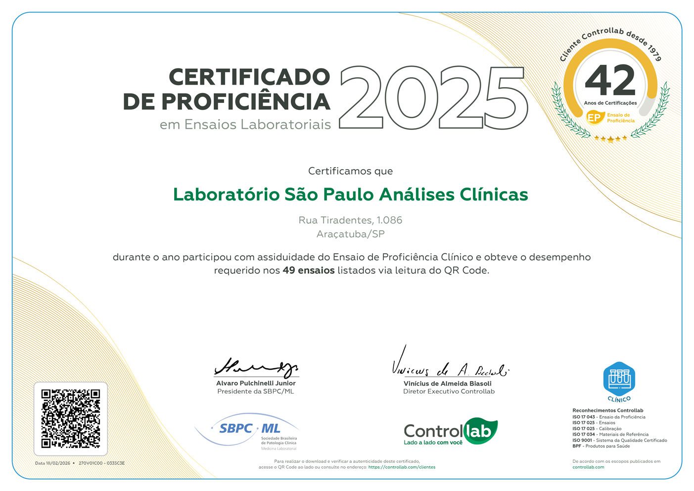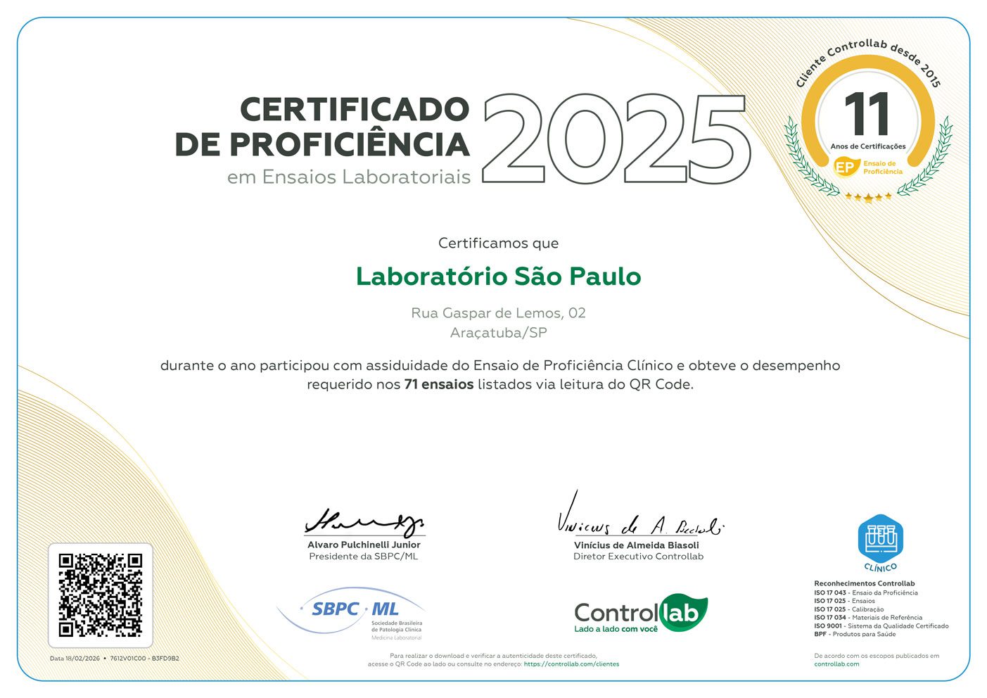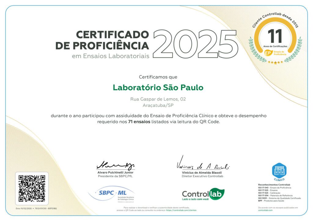 Desde 1978, o Laboratório São Paulo participa do programa de Ensaio de Proficiência, disponibilizado pelo Programa de Excelência para Laboratórios Médicos (PELM), gerenciado pela empresa Control Lab, em nível nacional.